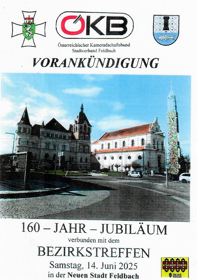 160 Jahr Jubiläum des ÖKB Stadtverband FEldbachBeginn:14.06.2025, 13:00 Uhr Ende:14.06.2025, 22:00 Uhr Ort:Rathhausplatz 1 in FeldbachVeranstalter:Österreichischer Kameradschaftsbund Stadtverband Feldbach Anton SchuhDas 160 Jahre Jubiläum des Stadtverbandes Feldbach wird genutzt um gemeinsam beim Bezirkstreffen in der neuen Stadt Feldbach zu feiern. InfosBez.Treffen-2025-Ankundigung.pdf (278.56 K)