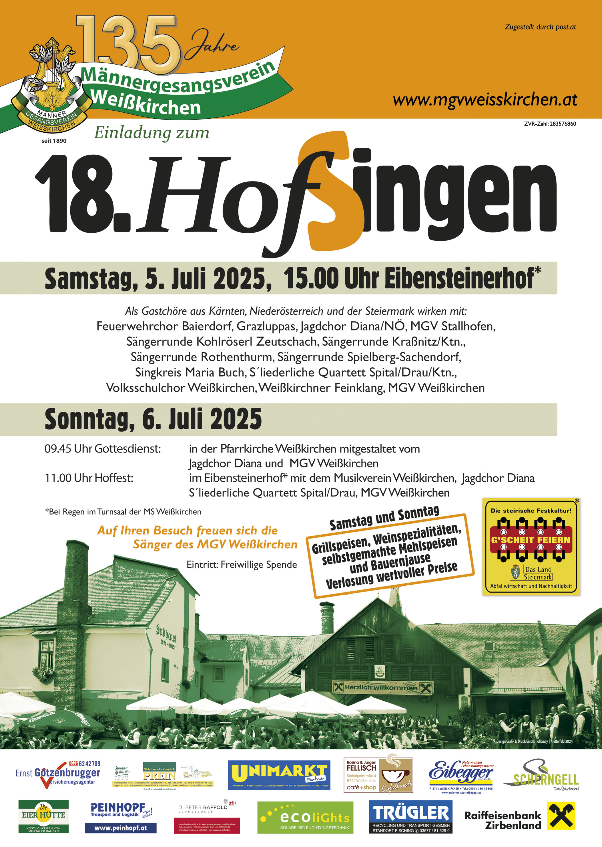 An diesem Wochenende haben 13 Chöre und der Musikverein Weißkirchen eine Klangwolke über den wunderschönen Innenhof des Gasthofes Bräuer gelegt. Mit herrlichem Gesang und Musik würde mit regionalen Köstlichkeiten und kulinarischen Schmankerln Gscheit gfeiert. Mehr unter https://www.mgvweisskirchen.at/aktuelles/hofsingen-2025.html