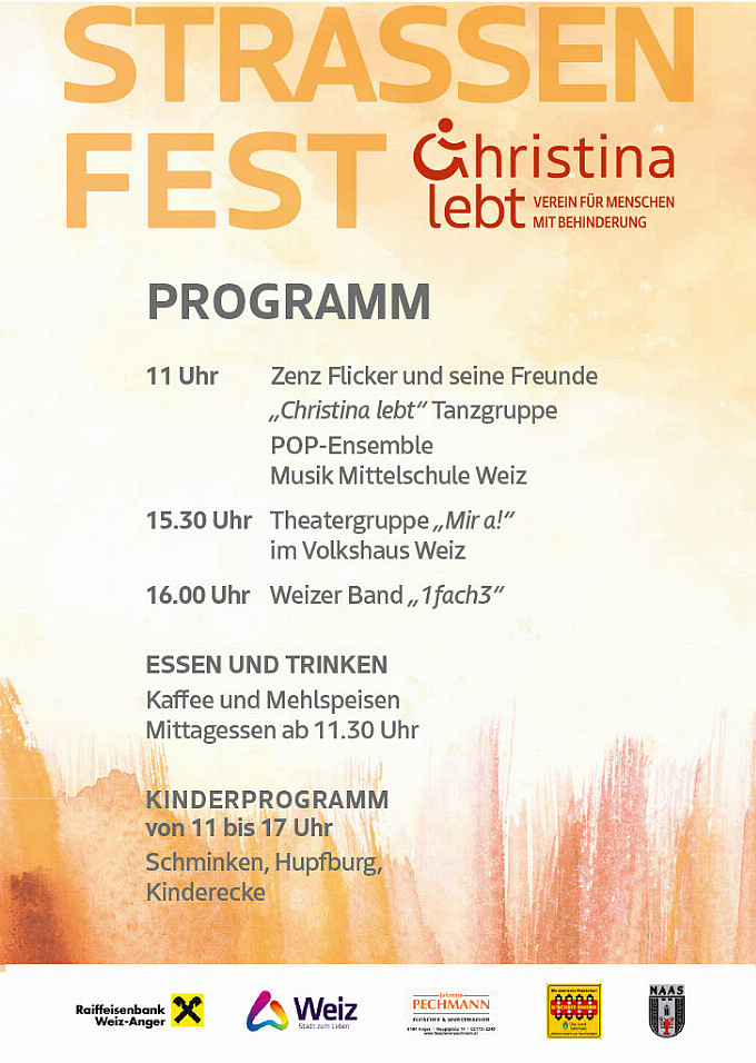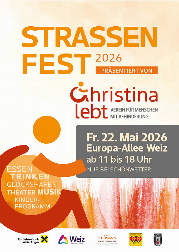 Straßenfest - Benefizveranstaltung für Menschen mit BehinderungBeginn:22.05.2026, 11:00 Uhr Ende:22.05.2026, 18:00 Uhr Ort:5 in WeizVeranstalter:Erwin Eggenreich MA, MAS Obmann Michaela Kaufmann, MSc Geschäftsführerin Benefizveranstaltung für Menschen mit Behinderung InfosStrassenfest-Flyer-A6-print.pdf (2.61 MB)