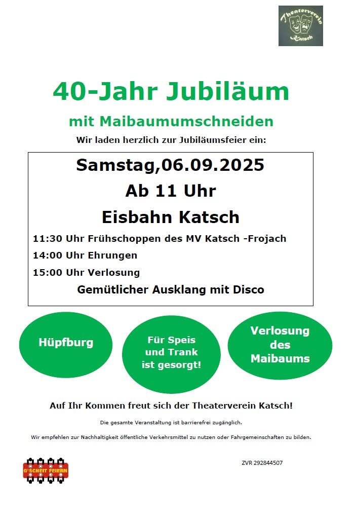 Zum 40 jährigen bestehen der Theaterrunde Katsch an der Mur, wird ein kleines Fest veranstaltet, bei welchem auch der Maibaum umgeschnitten wird. Am Vormittag wird die Veranstaltung von der Blasmusik Katsch an der Mur begleitet!