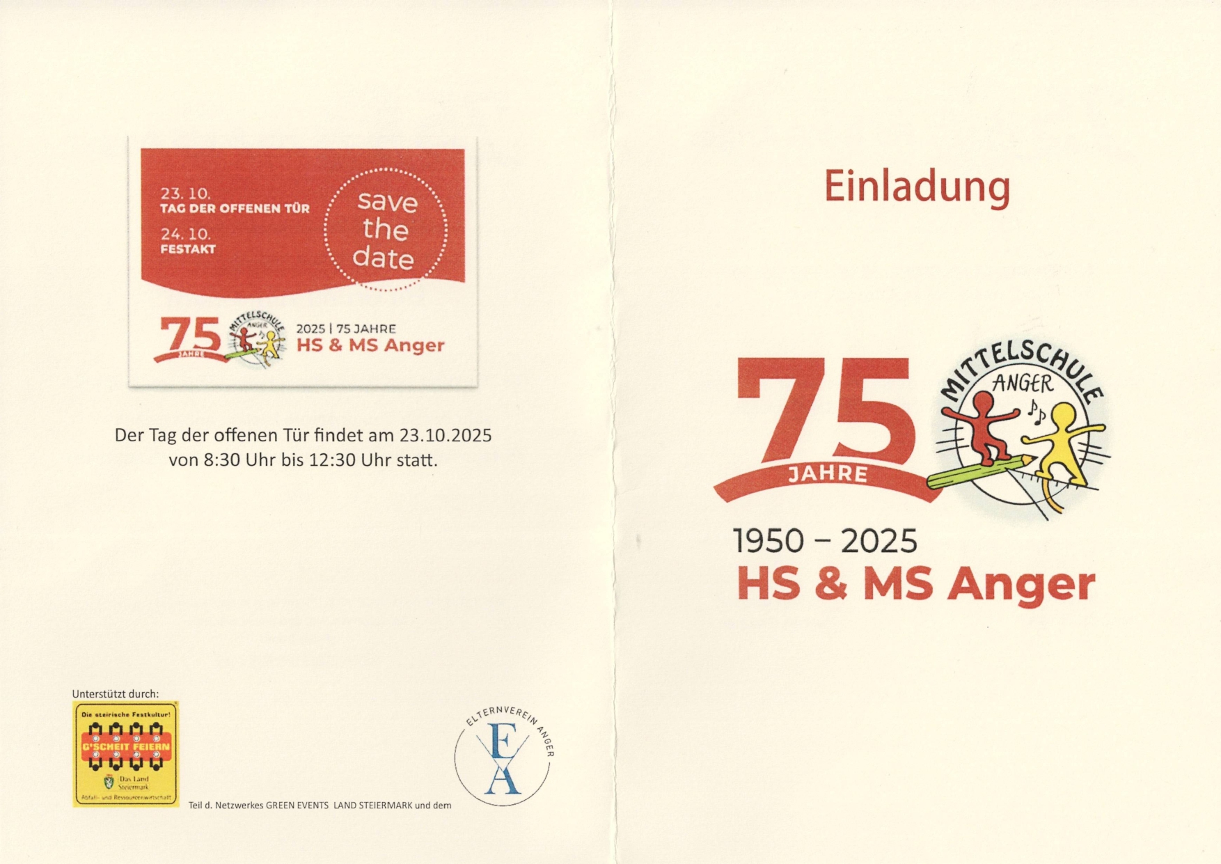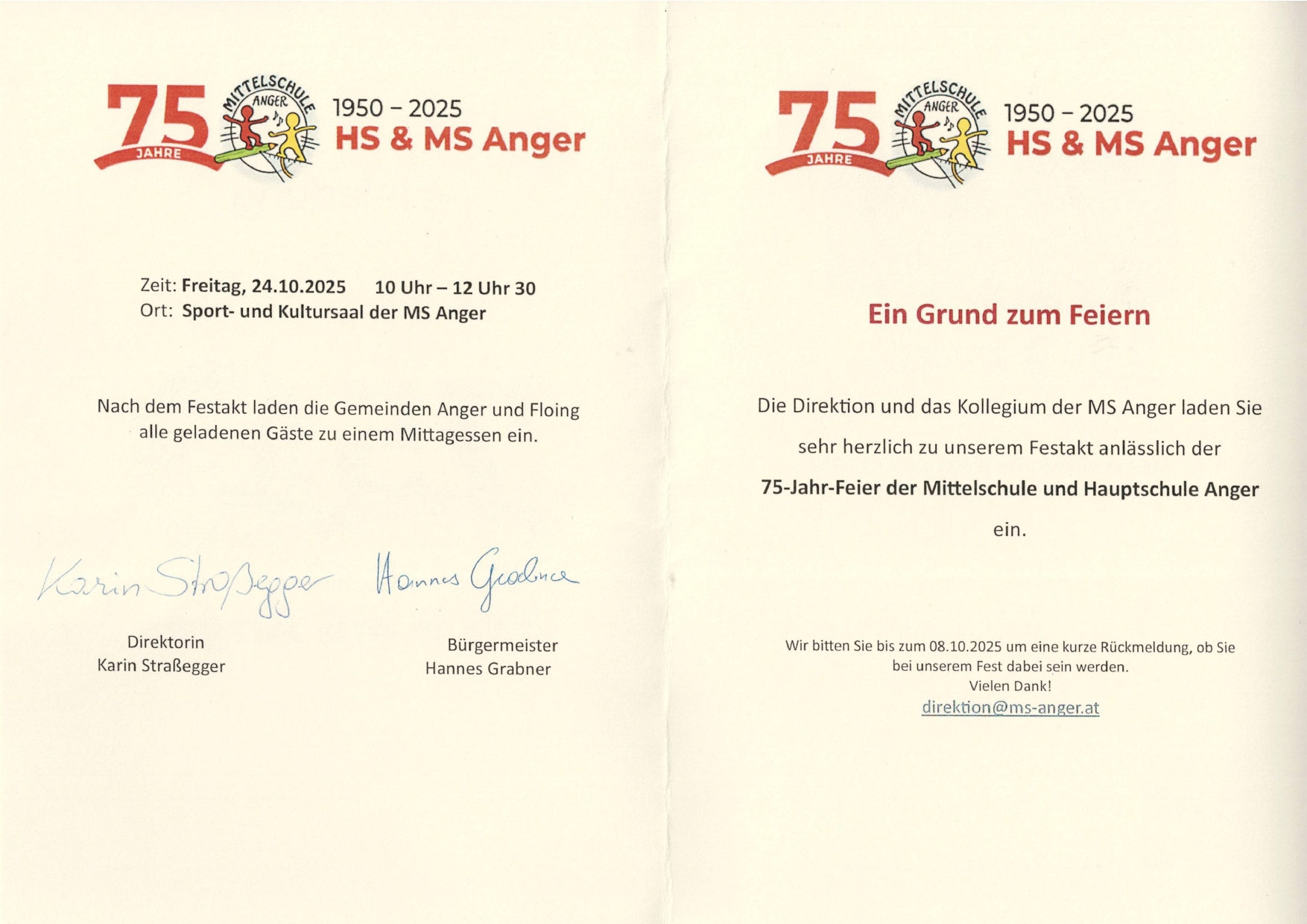 75 Jahre HS & MS AngerBeginn:24.10.2025, 10:00 Uhr Ende:24.10.2025, 17:00 Uhr Ort:Pettauer Straße 10 in AngerVeranstalter:Seniorenbund Anger - Waltraud Rosenberger75 Jahre HS & MS Anger 1950-2025 InfosEinladung Seite 1 (970.92 K)Einladung Seite 2 (967.55 K)