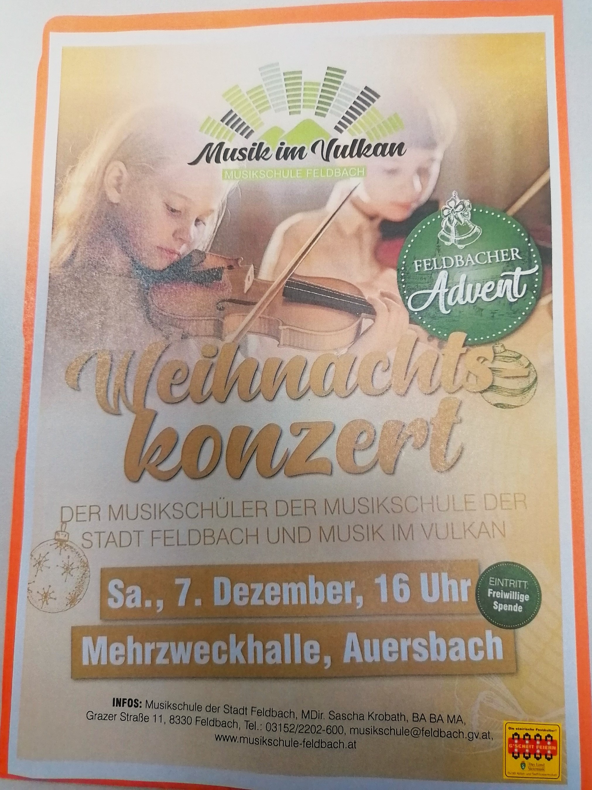 AdventkonzertBeginn:07.12.2024, 16:00 Uhr Ende:07.12.2024, 19:00 Uhr Ort:Wetzelsdorf 83 in FeldbachVeranstalter:Festkulturverein - Musikschule Feldbach, Musik im Vulkan, Monika BuchgraberMusikschülerInnen im Alter von 0-85 Jahren gestalten ein vorweihnachtliches Adventkonzert.InfosAdventkonzert (1.27 MB)