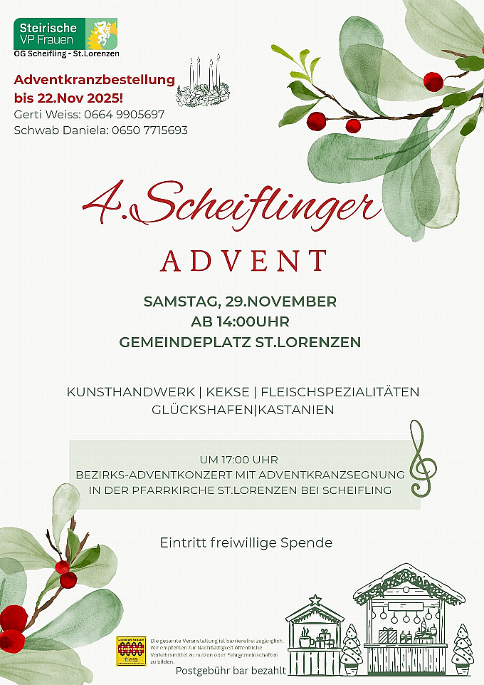 Am 29.11. veranstaltet die Ortsgruppe der VP Frauen Scheifling/St. Lorenzen einen Adventmarkt. Neben selbstgemachten Keksen wird in einer gemütlichen Atmosphäre auch Tee und Punsch ausgeschenkt.