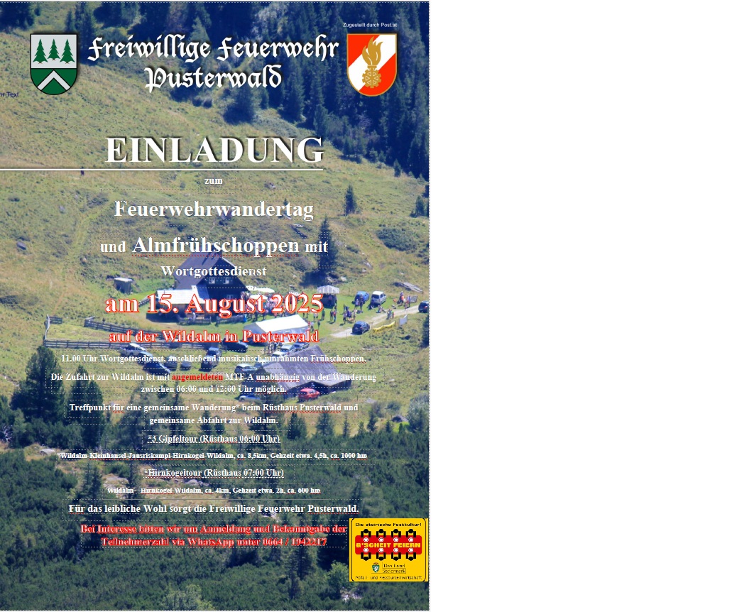 AlmfrühschoppenBeginn:15.08.2025, 10:00 Uhr Ende:15.08.2025, 19:00 Uhr Ort:Wildalm in PusterwaldVeranstalter:FF Pusterwald OBI Richard Gruber Feuerwehrwandertag und Almfrühschoppen mit WortgottesdienstInfosPostwurfsendung (319.46 K)