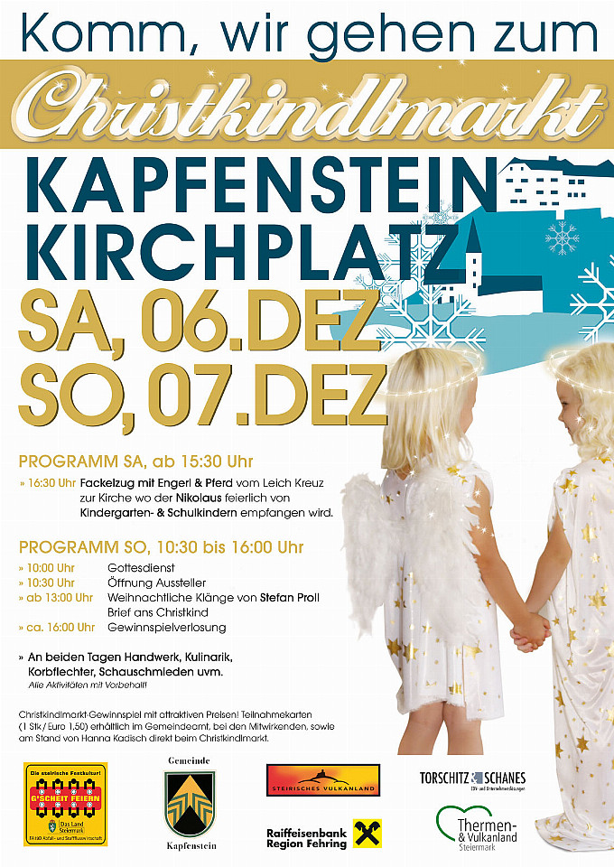 Christkindlmarkt 2025Beginn:06.12.2025, 15:30 Uhr Ende:07.12.2025, 17:00 Uhr Ort:Kapfenstein 3 in KapfensteinVeranstalter:Verein zur Sicherung der Nahversorgung in KapfensteinChristkindlmarkt am Kirchplatz in KapfensteinInfosw_CHM_Plakat_A2_2025.jpg (353.33 K)