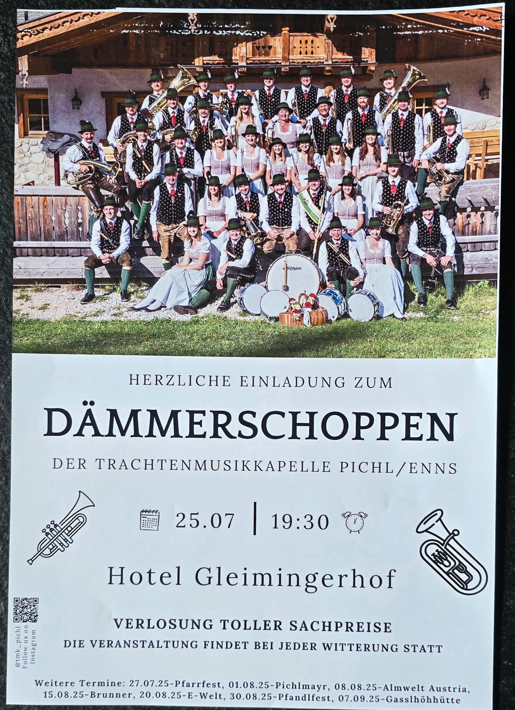 Dämmershoppen - Gleimingerhof 2025Beginn:25.07.2025, 16:00 Uhr Ende:25.07.2025, 23:59 Uhr Ort:Gleiming 27 in SchladmingVeranstalter:Geschäftsführer Trinker Andreas Dämmershoppen der Trachtenmusikkapelle Pichl an der EnnsInfosFlyer-2025.jpg (1.68 MB)Flyer-2025_1.jpg (1.68 MB)