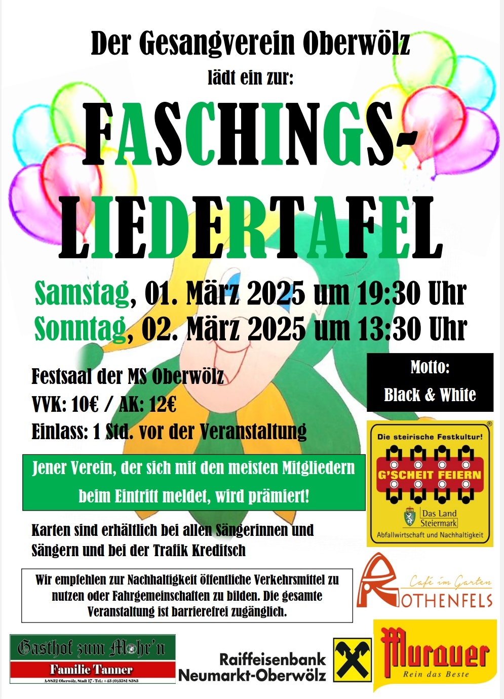 Faschingsliedertafel 2025Beginn:01.03.2025, 19:30 Uhr Ende:02.03.2025, 17:00 Uhr Ort:Vorstadt 70 in OberwölzVeranstalter:GV Oberwölz Obfrau Eva FreudenbergerFaschingsveranstaltung des Gesangvereines Oberwölz mit lustigen, kunterbunten Beiträgen wie Liedern, Sketches, G´stanzl usw.InfosFaschingsliedertafel 2025 (452.87 K)
