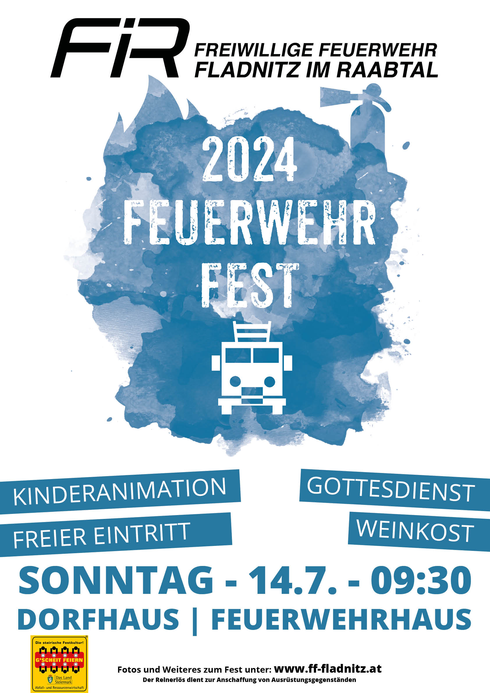 FF Fladnitz im RaabtalBeginn:13.07.2025, 09:30 Uhr Ende:13.07.2025, 18:00 Uhr Ort:Fladnitz im Raabtal 201 in Kirchberg an der RaabVeranstalter:Sabine RuhdorferFeuerwehrfest der FF Fladnitz mit Gottesdienst, Kinderanimation und gemütlichem Beisammensein mit kulinarischen Köstlichkeiten.InfosFlyer_2024_gscheitfeiern.jpg (327,87 K)