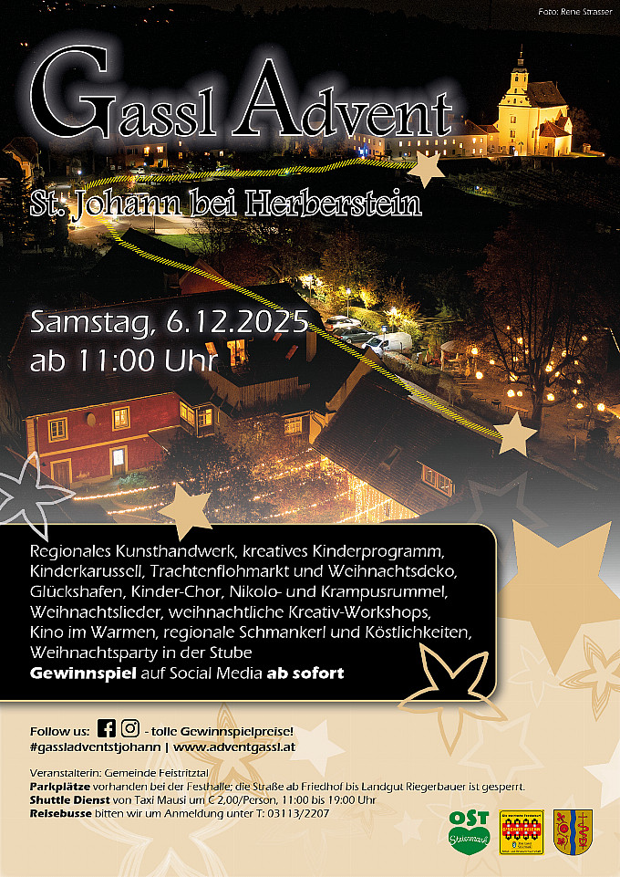 Adventmarkt mit regionalem Kunsthandwerk und regionalen Schmankerl, Trachtenflohmarkt, Kinderchor, Nikolaus für die Kinder, Krampus-Rummel, Advent- und Weihnachtslieder, nachhaltige Bastel-Workshops und vieles mehr beim 4. Gassl Advent St. Johann bei Herberstein.