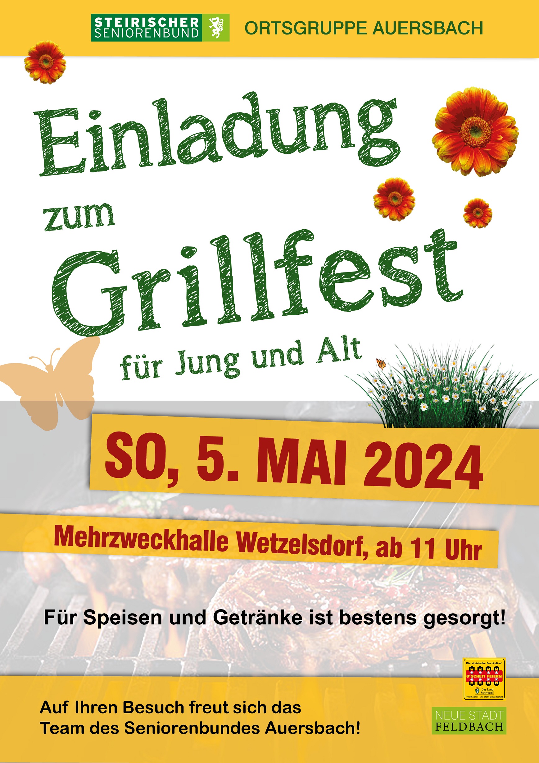 Grillfest für Jung und AltBeginn:05.05.2024, 11:00 Uhr Ende:05.05.2024, 18:00 Uhr Ort:Wetzelsdorf 83 in FeldbachVeranstalter:Seniorenbund OG AuersbachDer Seniorenbund OG Auersbach lädt zum Grillfest für Jung und Alt.InfosEinladung-Grillfest.jpg (930,10 K)