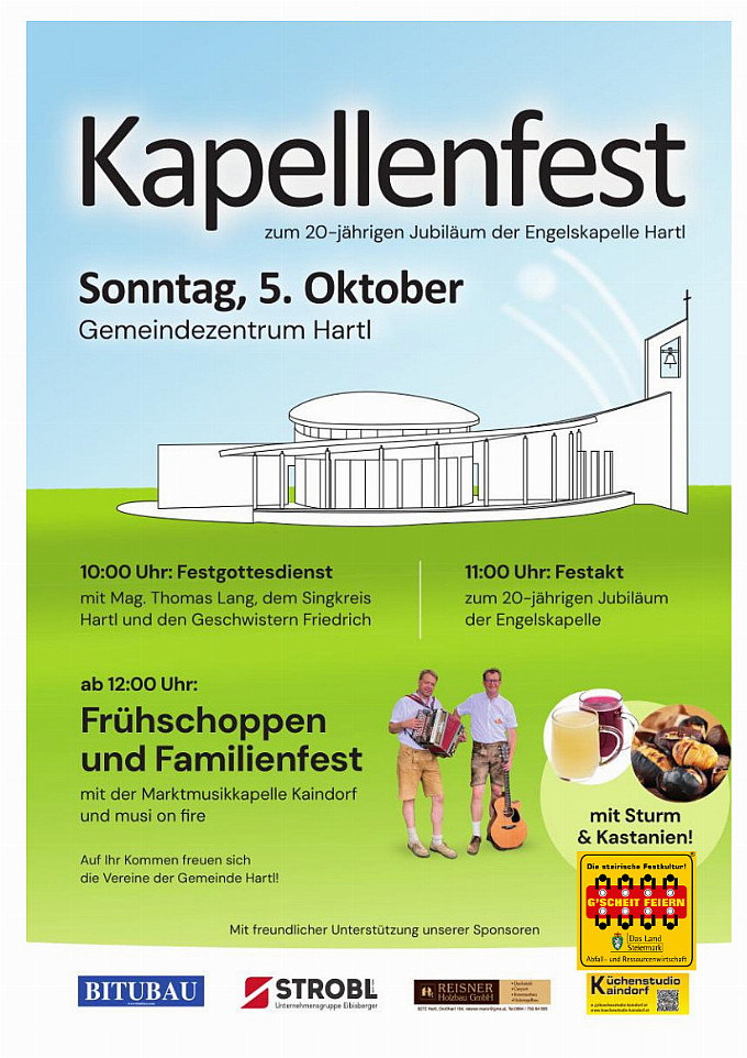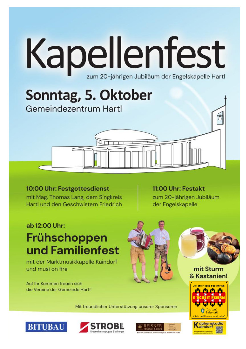 Kapellenfest 5.10.2025Beginn:05.10.2025, 10:00 Uhr Ende:05.10.2025, 23:45 Uhr Ort:Hartl 185 in HartlVeranstalter:Thomas Pußwald20 Jahr Jubiläum der Engelskapelle mit Gottesdienst, Ehrung von Gemeindefunktionären, Frühschoppen und FamiliennachmittagInfosFlugblatt (205.75 K)