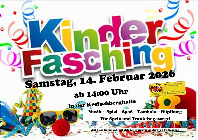 Der Elternverein der MVS St. Georgen am Kreischberg lädt zum alljährlichen Kinderfasching ein. Es erwartet euch Musik, Spiel, Spaß, eine Hüpfburg und eine Tombola! Für Speis und Trank ist gesorgt!