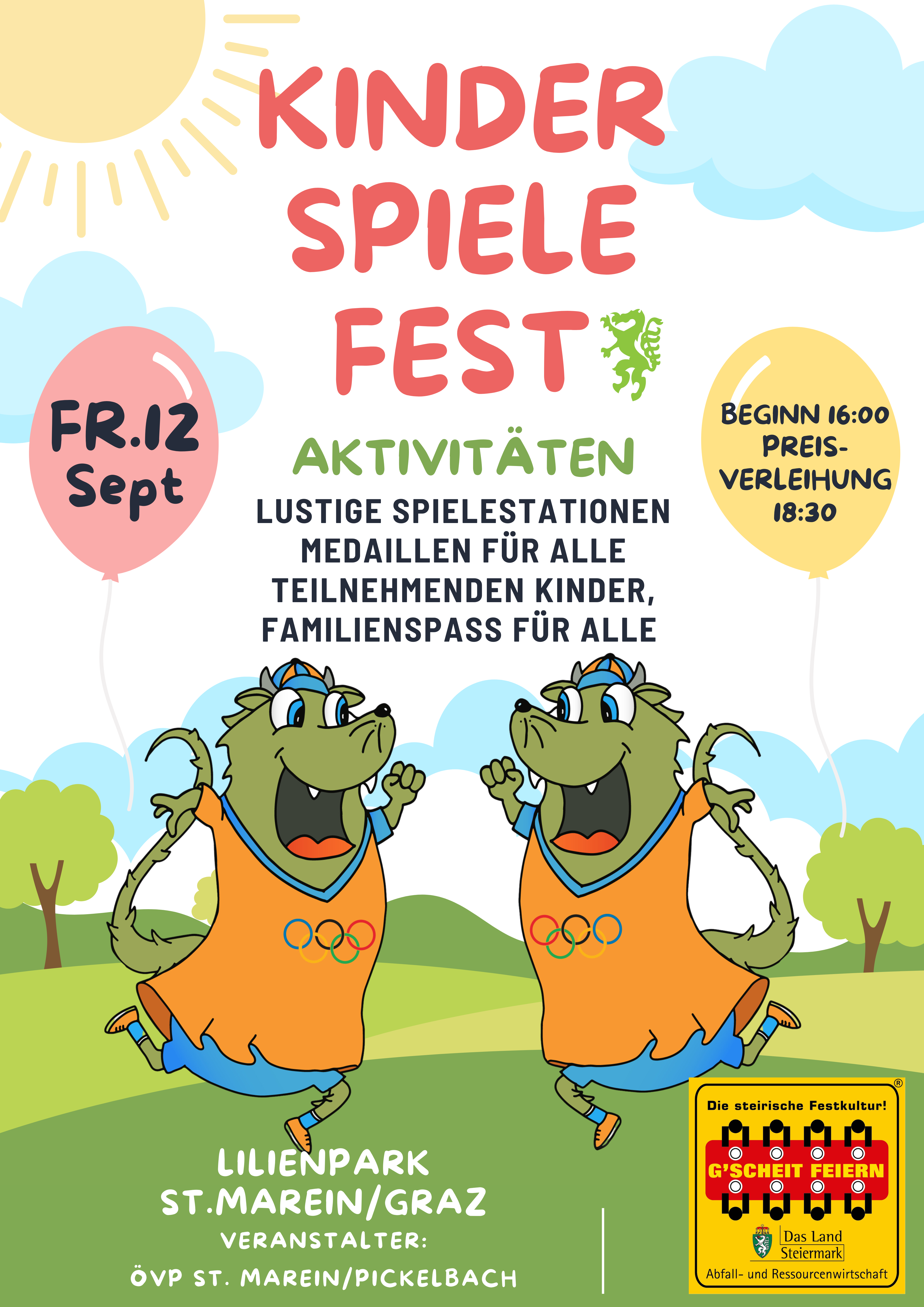 Kurz nach Ende der großen Sommerferien laden wir zum traditionellen Kinderspielefest in den Lilienpark St. Marein/Graz. Bei freiem Eintritt spielen Kinder mit ihren Begleitpersonen altersgerechte Aktivspiele. Spaß und das aktive Miteinander stehen im Vordergrund. Um 18:30 Uhr folgt die Medaillienübergabe an alle teilnehmenden Kinder und Verlosung von tollen Preisen. So wird jedes Kind (und jeder Erwachsene natürlich auch) zum Gewinner.