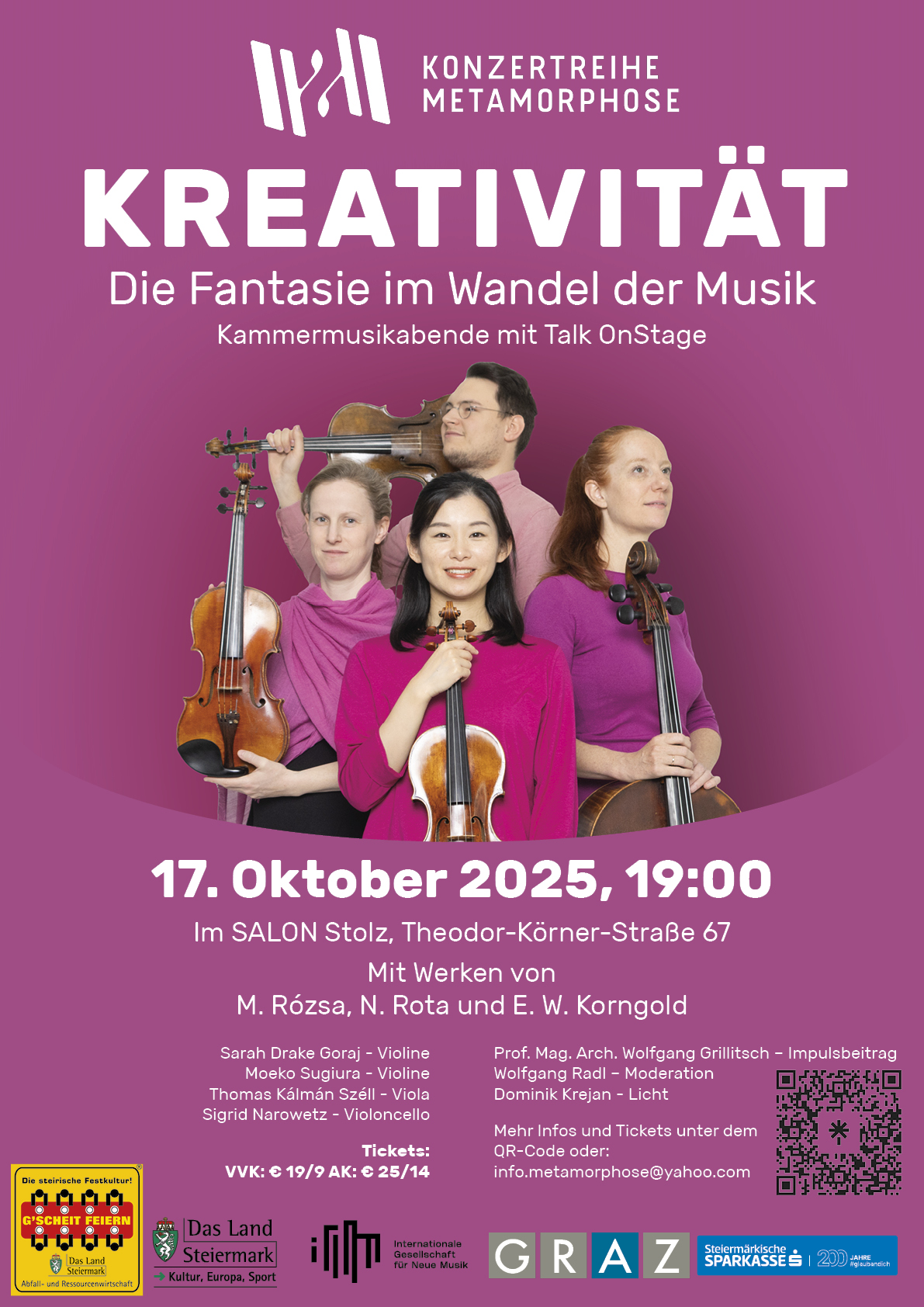 Konzertreihe Metamorphose 2025 - KREATIVITÄTBeginn:17.10.2025, 19:00 Uhr Ende:17.10.2025, 21:00 Uhr Ort:Theodor-Körner-Straße 67 in GrazVeranstalter:Metamorphose - Verein zur Förderung der Kammermusikwww.facebook.com/Konzertreihe.MetamorphoseInfosKREATIVITAT_PLAKAT.jpg (907.29 K)