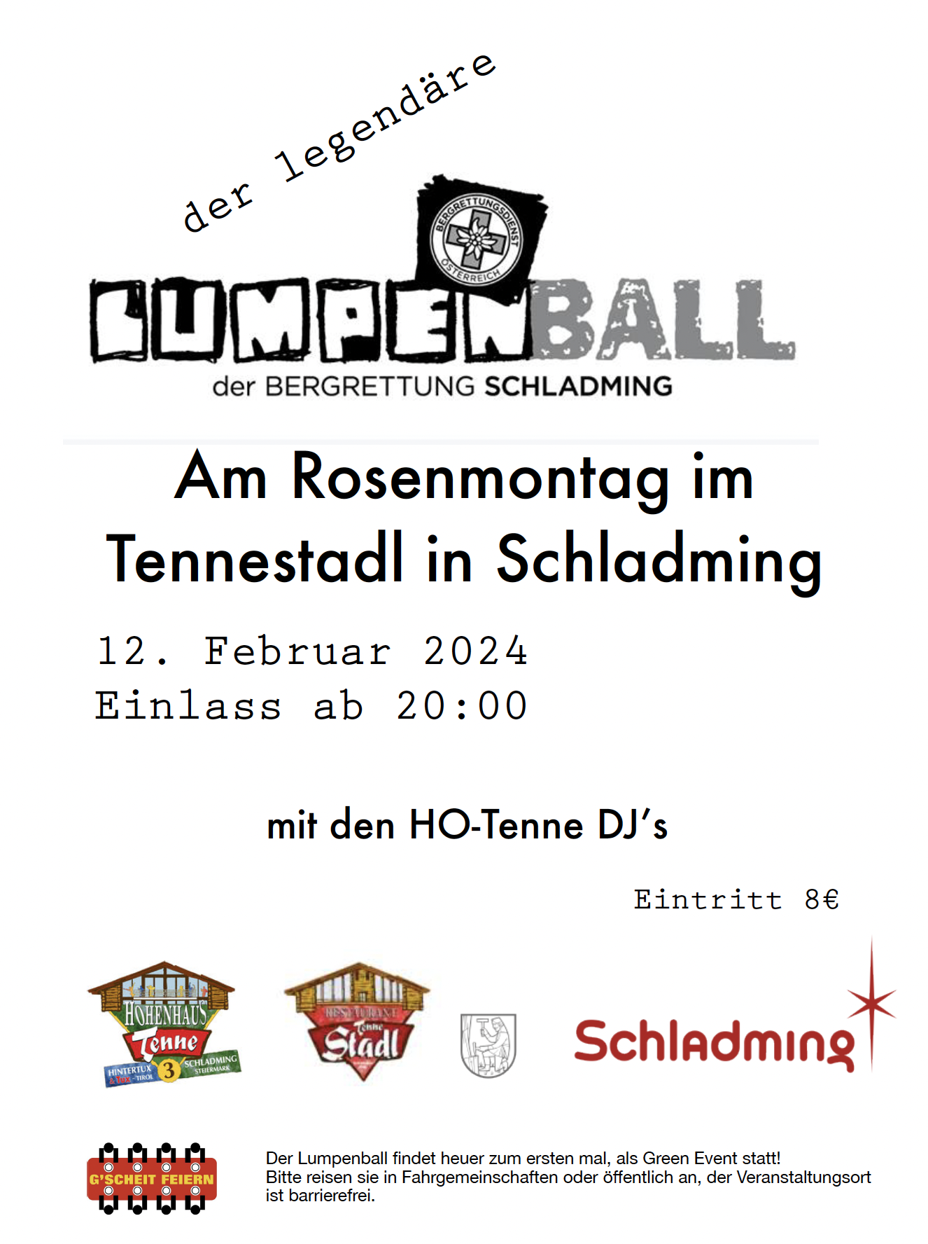 Lumpenball 2024Beginn:12.02.2024, 20:00 Uhr Ende:13.02.2024, 06:00 Uhr Ort:Tennestadl in SchladmingVeranstalter:Patrick LaszloFaschingsveranstaltung der Bergrettung SchladmingInfosLumpenball (1,19 MB)