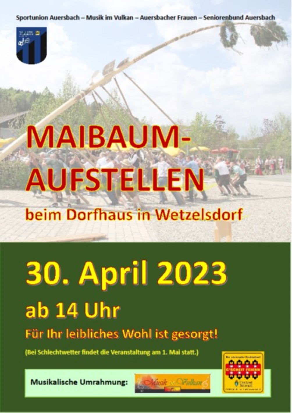 Maibaum aufstellen des Festkulturvereins AuersbachBeginn:30.04.2023, 14:00 Uhr Ende:30.04.2023, 20:00 Uhr Ort:Wetzelsdorf 83 in FeldbachVeranstalter:Festkulturverein AuersbachBrauchtumsveranstaltung - Maibaum aufstellen vor dem Dorfhaus. Musikalische Umrahmung durch Musikschüler von "Musik im Vulkan".InfosEinladung.jpg (259,00 K)