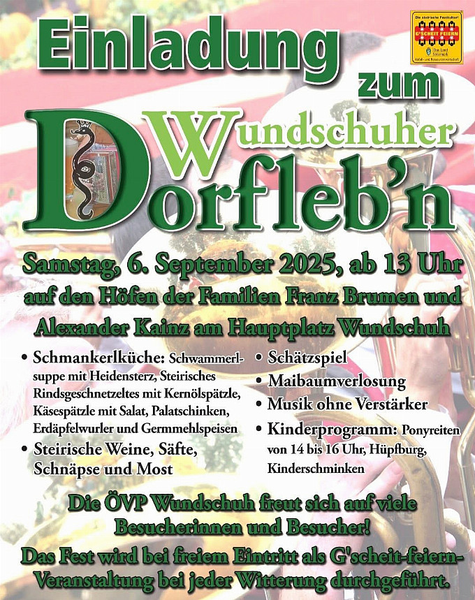Wundschuher Dorfleb'nBeginn:06.09.2025, 13:00 Uhr Ende:06.09.2025, 23:58 Uhr Ort:Hauptplatz 16 in WundschuhVeranstalter:ÖVP Wundschuh Wundschuher Dorfleb'nInfosEinladung (376.92 K)