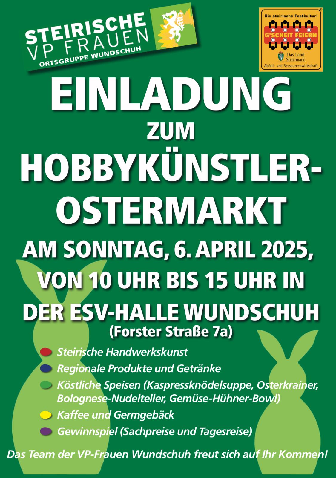 Ostermarkt 2025Beginn:06.04.2025, 10:00 Uhr Ende:06.04.2025, 16:00 Uhr Ort:Forsterstraße 7a in WundschuhVeranstalter:Barbara WalchHobbykünstlermarktInfosFlyer Ostermarkt 2025 (190.31 K)