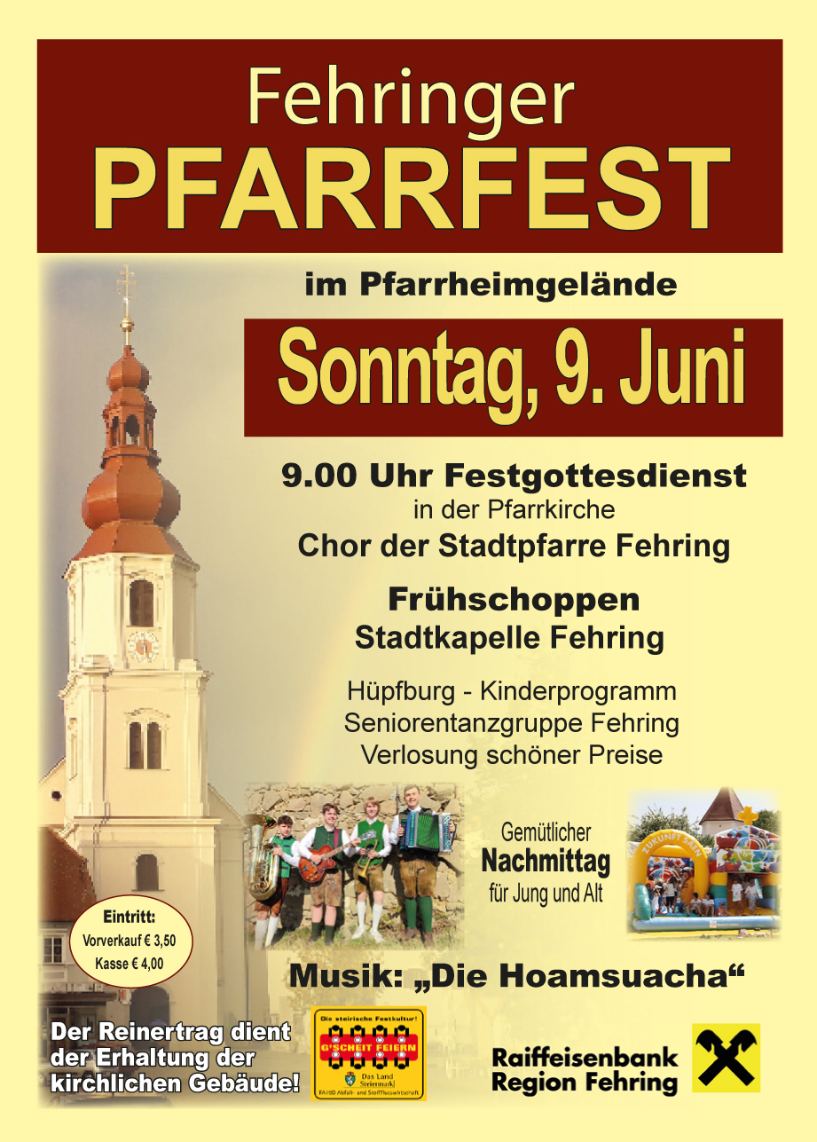 Pfarrfest FehringBeginn:09.06.2024, 10:00 Uhr Ende:09.06.2024, 17:00 Uhr Ort:Grazerstraße 10 in FehringVeranstalter:Felix Halbedl Röm. kath. Pfarramt FehringPfarrfest FehringInfosPfarrfest Fehring (750,86 K)