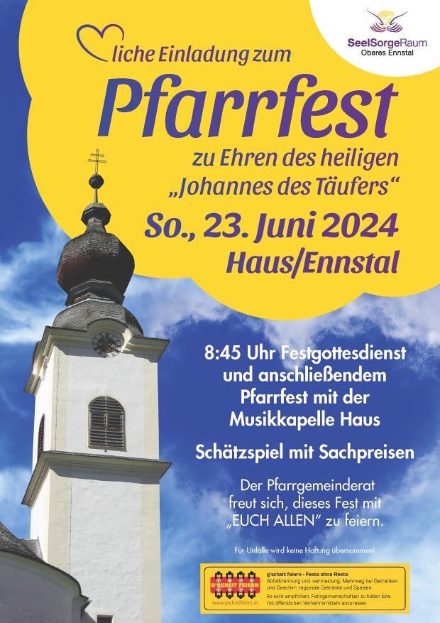 Pfarrfest Haus 2024Beginn:23.06.2024, 09:30 Uhr Ende:23.06.2024, 16:00 Uhr Ort:Kirchengasse 1 in HausVeranstalter:Nikola MitterwallnerPfarrfest zu Ehren des Hl. Johannes d. T. mit der Musikkapelle Haus , 8.45 Festgottesdienst, anschließend gemütliches Beisammensein beim Pfarrfest im Kindergartengarten.InfosPlakat Pfarrfest Haus (92,07 K)