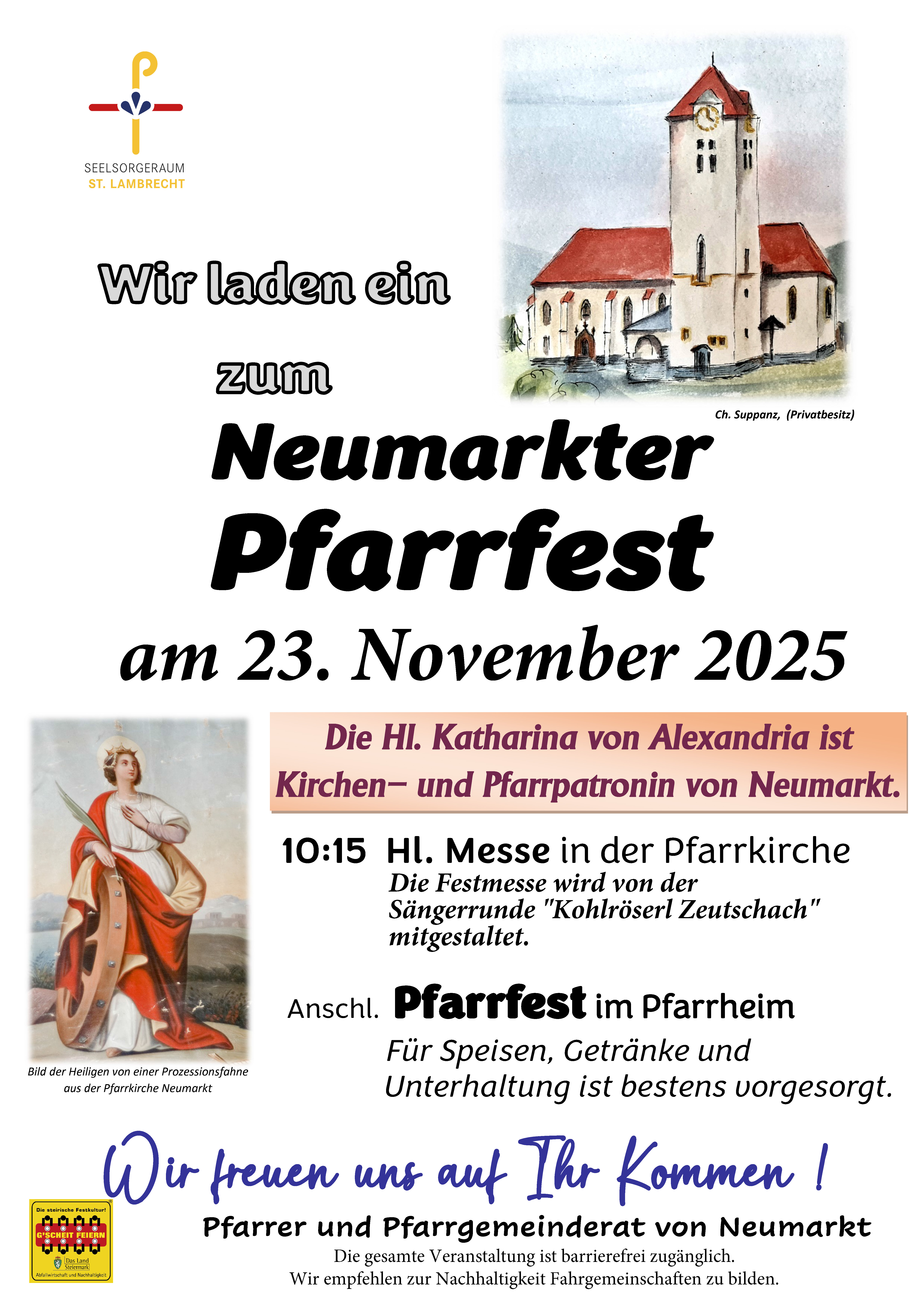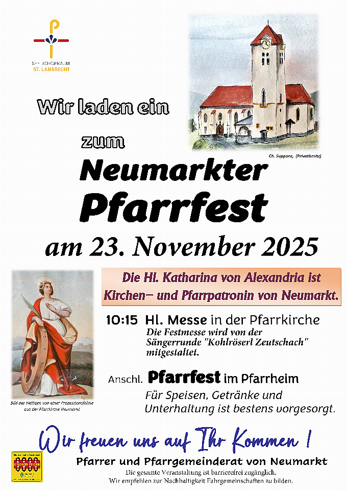 Pfarrfest 2025 der Pfarre NeumarktBeginn:23.11.2025, 11:30 Uhr Ende:23.11.2025, 18:00 Uhr Ort:Sportstraße 8 in Neumarkt in der SteiermarkVeranstalter:Röm.kath.Pfarre Neumarkt in der SteiermarkPfarrfest der Röm.kath.Pfarre Neumarkt in der Steiermark im Pfarrheim NeumarktInfos2025-11-23-Plakat-Pfarrfest-2025-GF.jpg (3.15 MB)