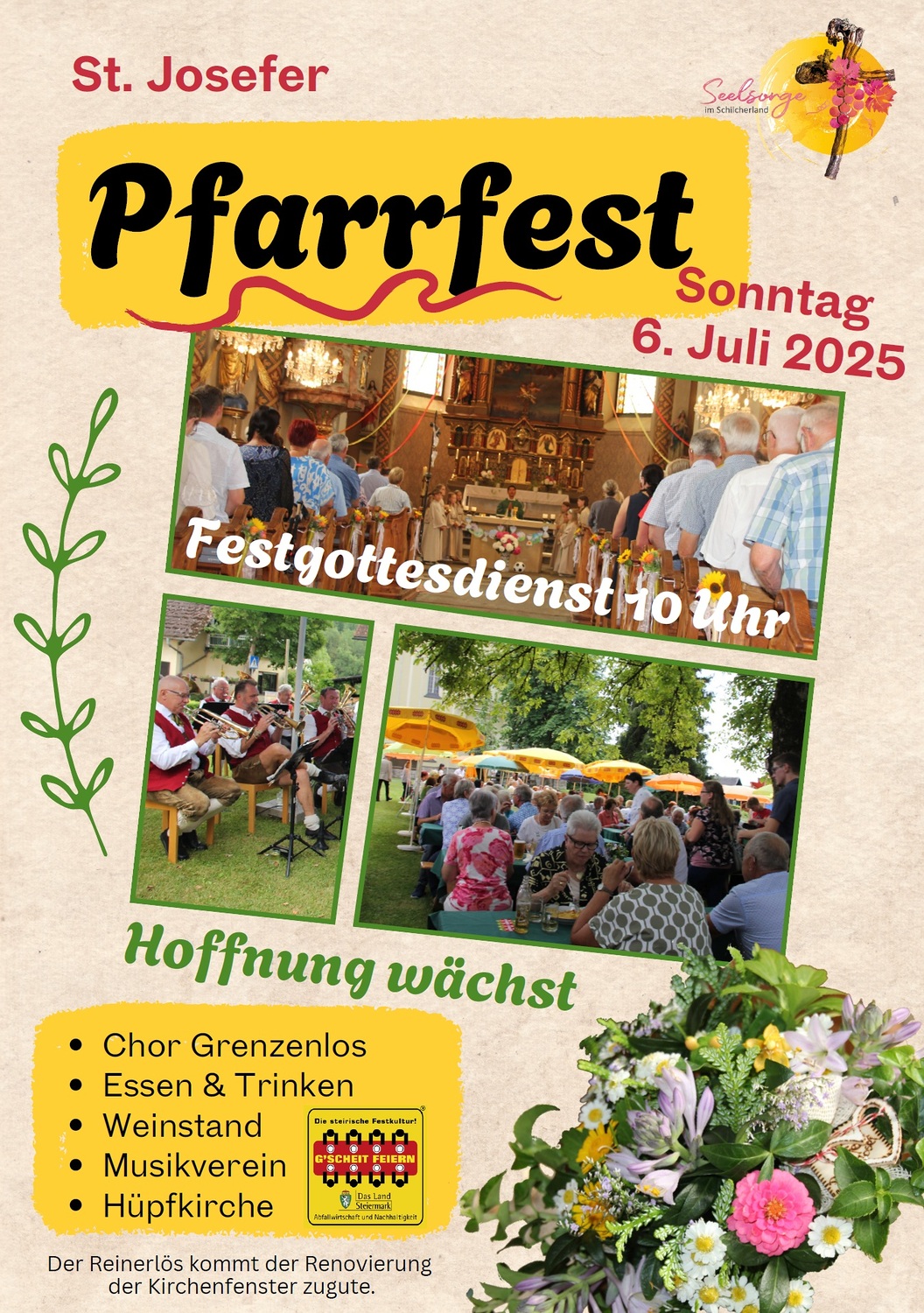 Am 6. Juli 2025 findet das Pfarrfest der Pfarre St. Josef/Weststeiermark statt. Nach der vom Chor "Grenzenlos" gestalteten Festmesse um 10.00 Uhr folgt im Pfarrhofgelände ein Frühschoppen mit dem Musikverein St. Josef sowie anschließend Unterhaltung mit "DJ Amitie"