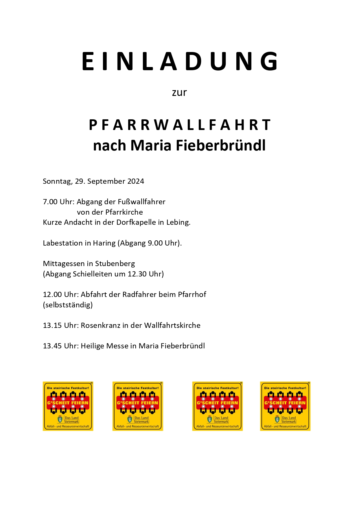 Pfarrwallfahrt der Pfarre Anger bzw. Wanderung oder Radtour der Teilnehmer nach Maria Fieberbründl