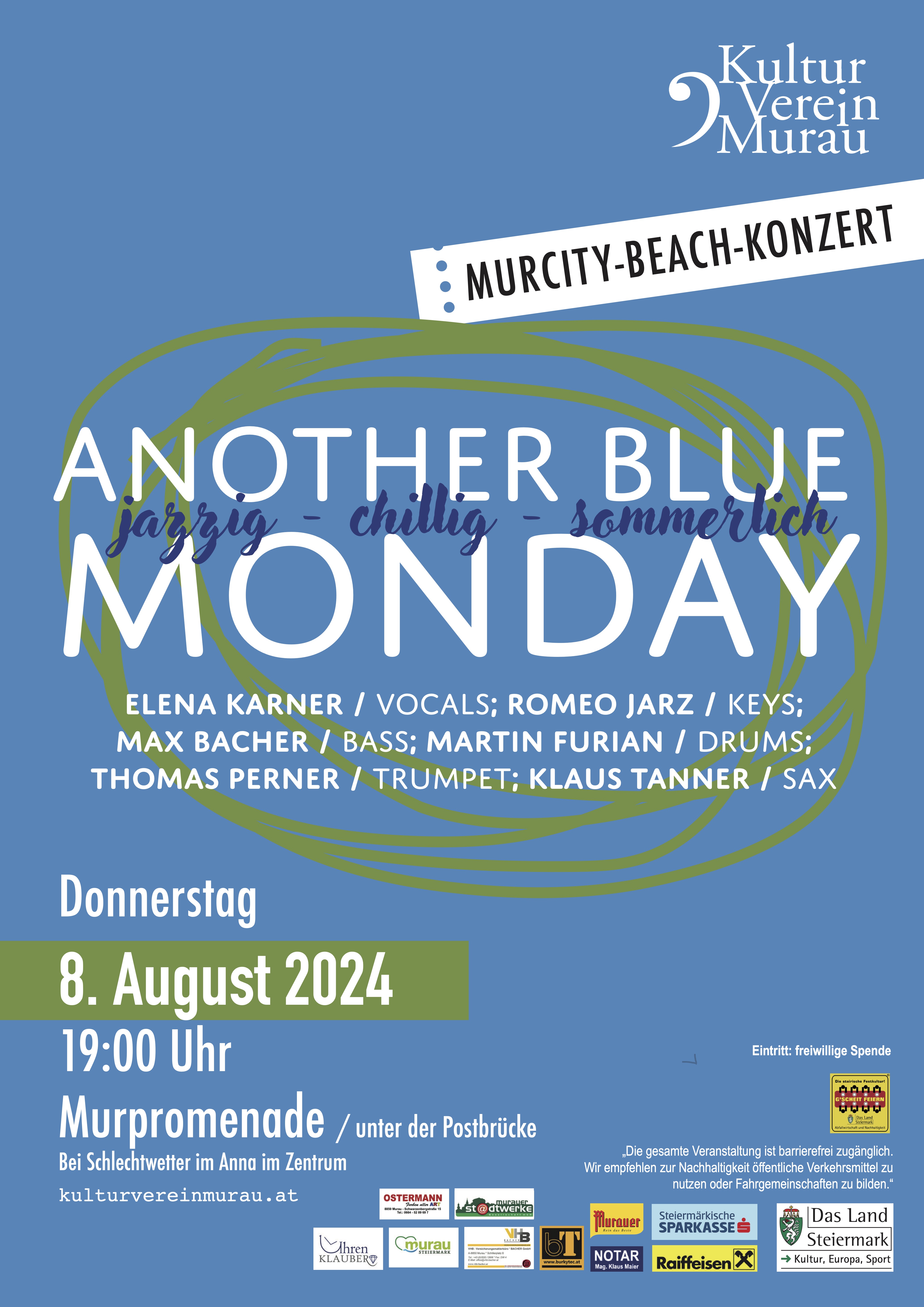 PromenadenkonzertBeginn:08.08.2024, 19:00 Uhr Ende:08.08.2024, 22:00 Uhr Ort:Grazerstraße 4 in MurauVeranstalter:Reinhard KöckAnother Blu Monday Open Air Jazz Konzert jazzig chillig sommerlich Infoskv_promenadenkonz_24.jpg (1,53 MB)
