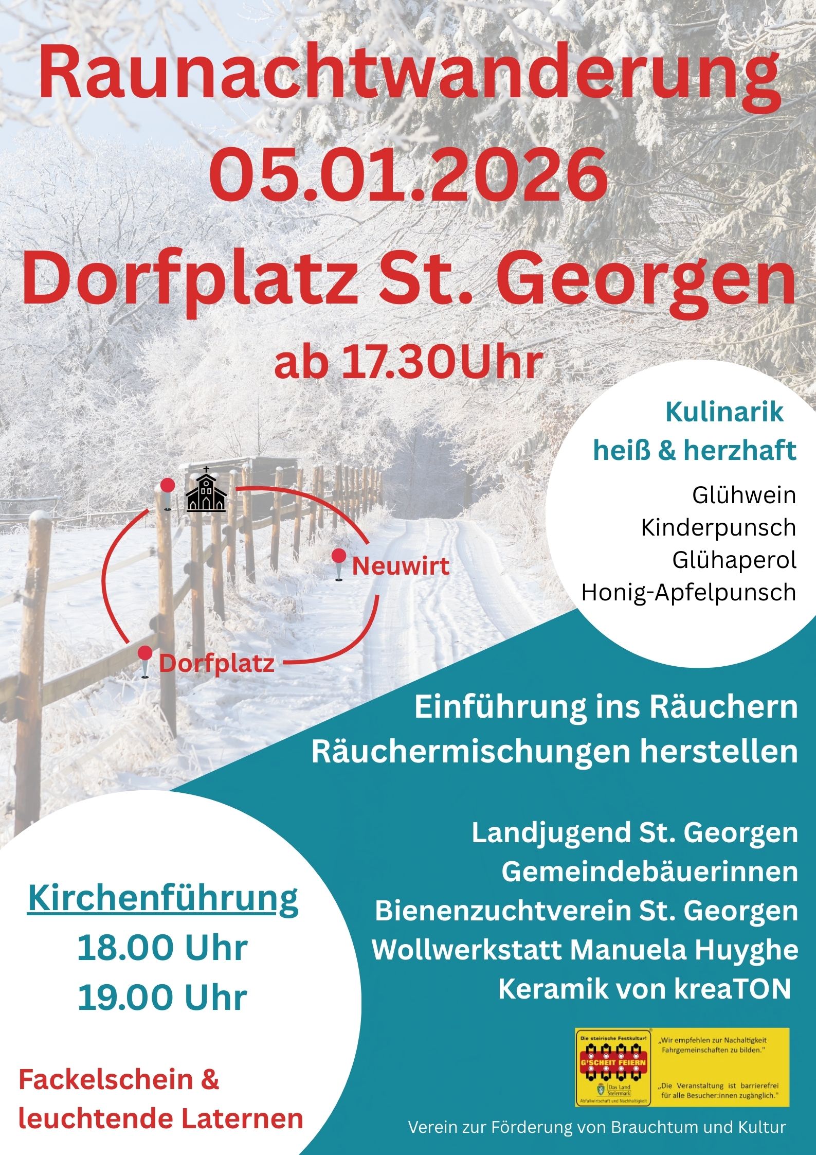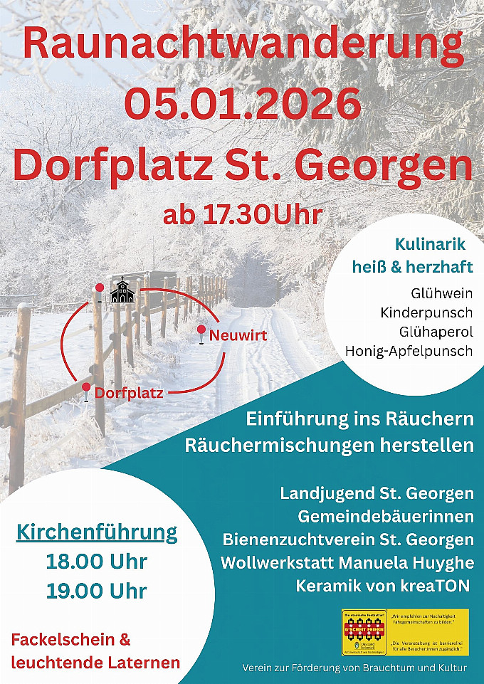 Erleben Sie die letzte Raunacht mit einer Einführung in die Räucherei und dem Zusammenstellen eigener Räuchermischungen. Fackeln und leuchtende Laternen zeigen Ihnen den Weg. Am Räucherrundgang entdecken Sie Keramik von kreaTON, viele Köstlichkeiten vom Bienenzuchtverein St. Georgen inklusive Glühaperol und Honig-Apfelpunsch und die Wollwerkstatt. Die Landjugend und Gemeindebäuerinnen sorgen mit köstlichen Speisen und Getränken für Ihr leibliches Wohl.