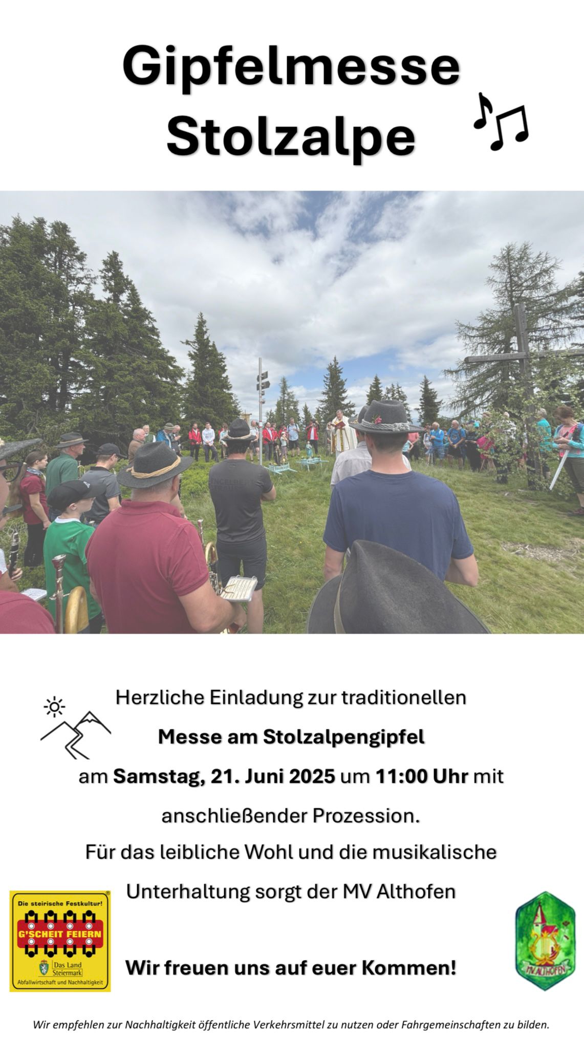 Der MV Althofen veranstaltet seine jährliche Gipfelmesse auf der Stolzalpen-Kapelle. Neben der Messe um 10:00 Uhr wird im Anschluss ab 12:00 Uhr ein kleines Marschkonzert gespielt.