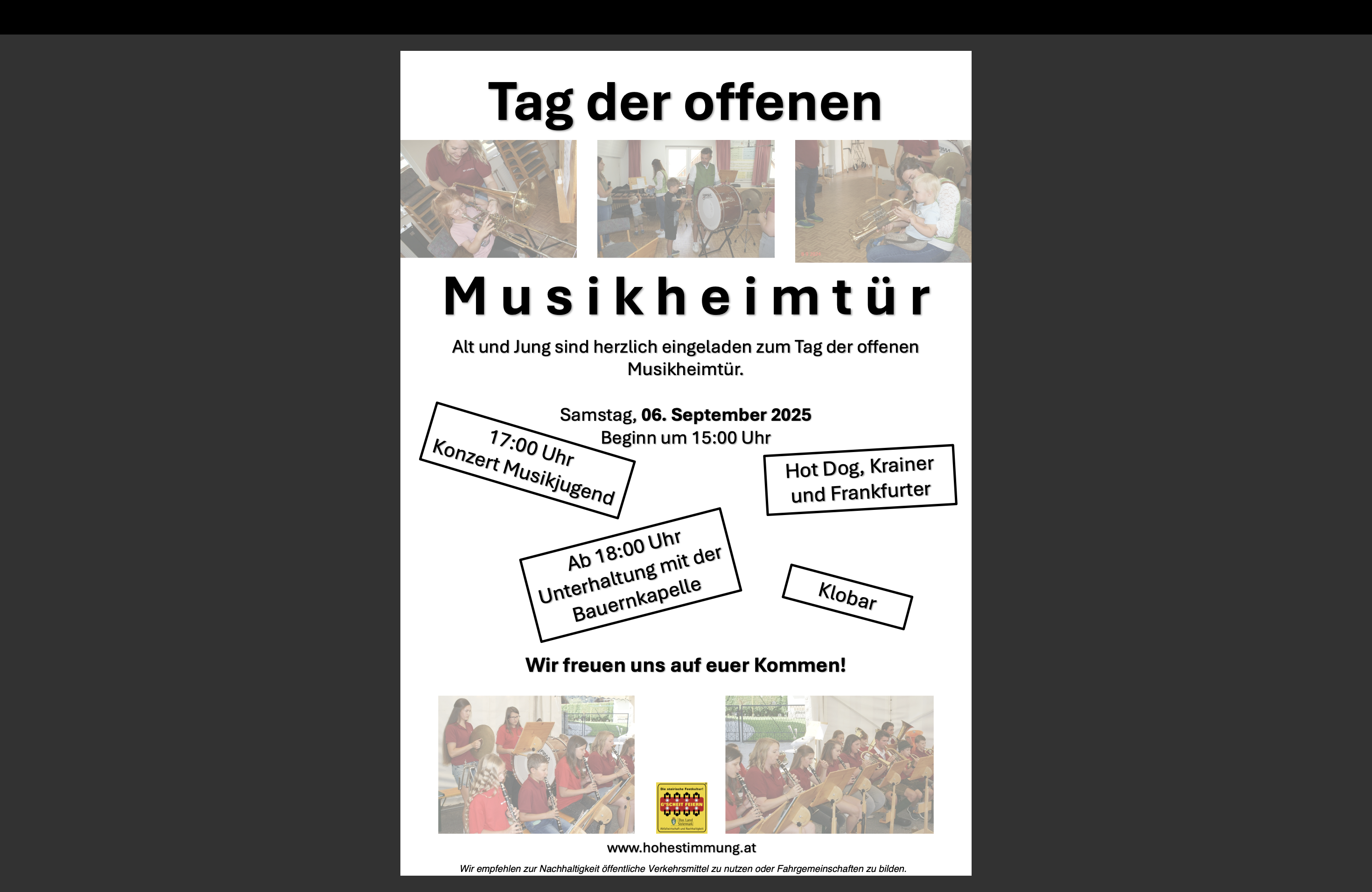 Die Veranstaltung dient dazu, Jung und Alt zu motivieren, ein Instrument zu erlernen. An diesem Tag dürfen alle Instrumente ausprobiert werden. Es wird ein Konzert unserer Musikjugend geben und anschließend wird die Bauernkapelle für gute Stimmung sorgen.