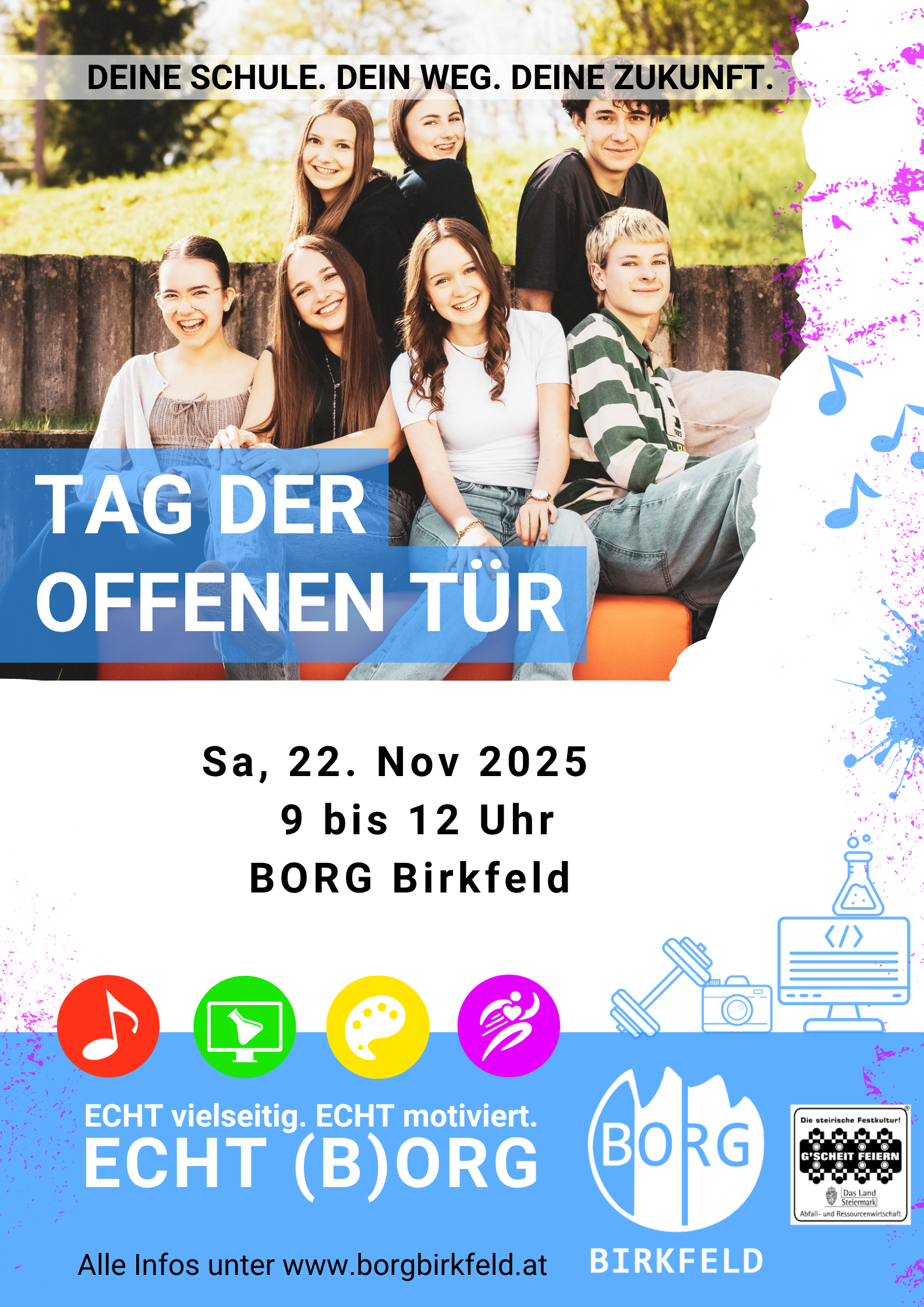 Tag der offenen Tür am BORG BirkfeldBeginn:22.11.2025, 09:00 Uhr Ende:22.11.2025, 12:00 Uhr Ort:Birkengasse 1 in BirkfeldVeranstalter:Mag, Michael, Krenn-GuglTag der offenen Tür am BORG BirkfeldInfosPlakat-TdoT-A2.png (3.52 MB)