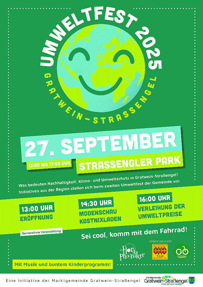 Umweltfest 2025 - Was bedeuten Nachhaltigkeit, Klima- und Umweltschutz in Gratwein-Straßengel? Initiativen aus der Region stellen sich beim Umweltfest der Gemeinde vor. Umrahmt wird die Veranstaltung mit Musik, einem abwechslungsreichen Kinderprogramm, einer Modenschau und die Verleihung des Umweltpreises.