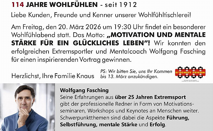 Wohlfühlabend 2026Beginn:20.03.2026, 19:30 Uhr Ende:20.03.2026, 23:59 Uhr Ort:Schützing 4 in RiegersburgVeranstalter:Tischlerei Knaus eU Annelies KnausWohlfühlabend 2026 mit Wolfgang FaschingInfos2026_fasching_socmed-einldg.pdf (1.61 MB)