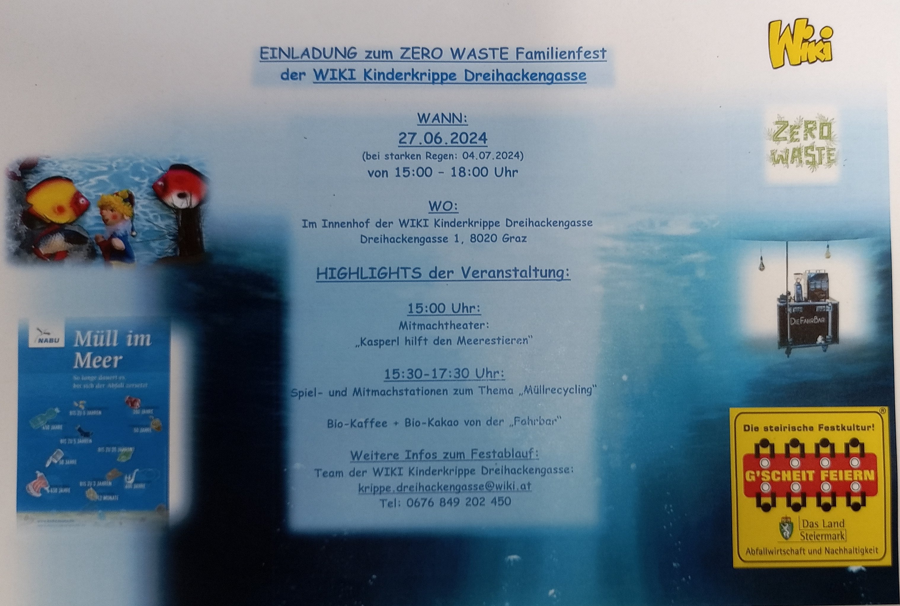 Die Kinderkrippe Dreihackengasse organisiert jedes Jahr ein nachhaltiges Fest für die ganze Familie und die Anrainer der Kinderkrippe. Zero Waste staht dabei im Fokus. Dieses Jahr haben wir uns zum Anlass genommen um auf die Verschmutzung der Meere und Gewässer hinzuweisen und erarbeiten mit den Kindern dieses Thema ganzheitlich. Als Höhepunkt des festes spielen wir das Mitmachtheater "Kasperl hilft den Meerestieren". Dieses Stück wird gemeinsam mit den Kindern selbstbestimmt geschrieben, erarbeitet und uraufgeführt. Gemeinsam mit den Familien bieten wir ein vielfälltiges, biologisches Buffet an, das nur mit regionalen Produkten produziert wird. Jeder Gast bekommt Mehrweggeschirr zur Verfügung gestellt (1 Tasse + 1 Teller /Besucher), dieses Geschirr nehmen die Gäste mit nach Hause, waschen es dort und bringen es wieder in die Kinderkrippe zurück. Bio Kaffee und BIO Kaffee kommt von der "Fahrbar".